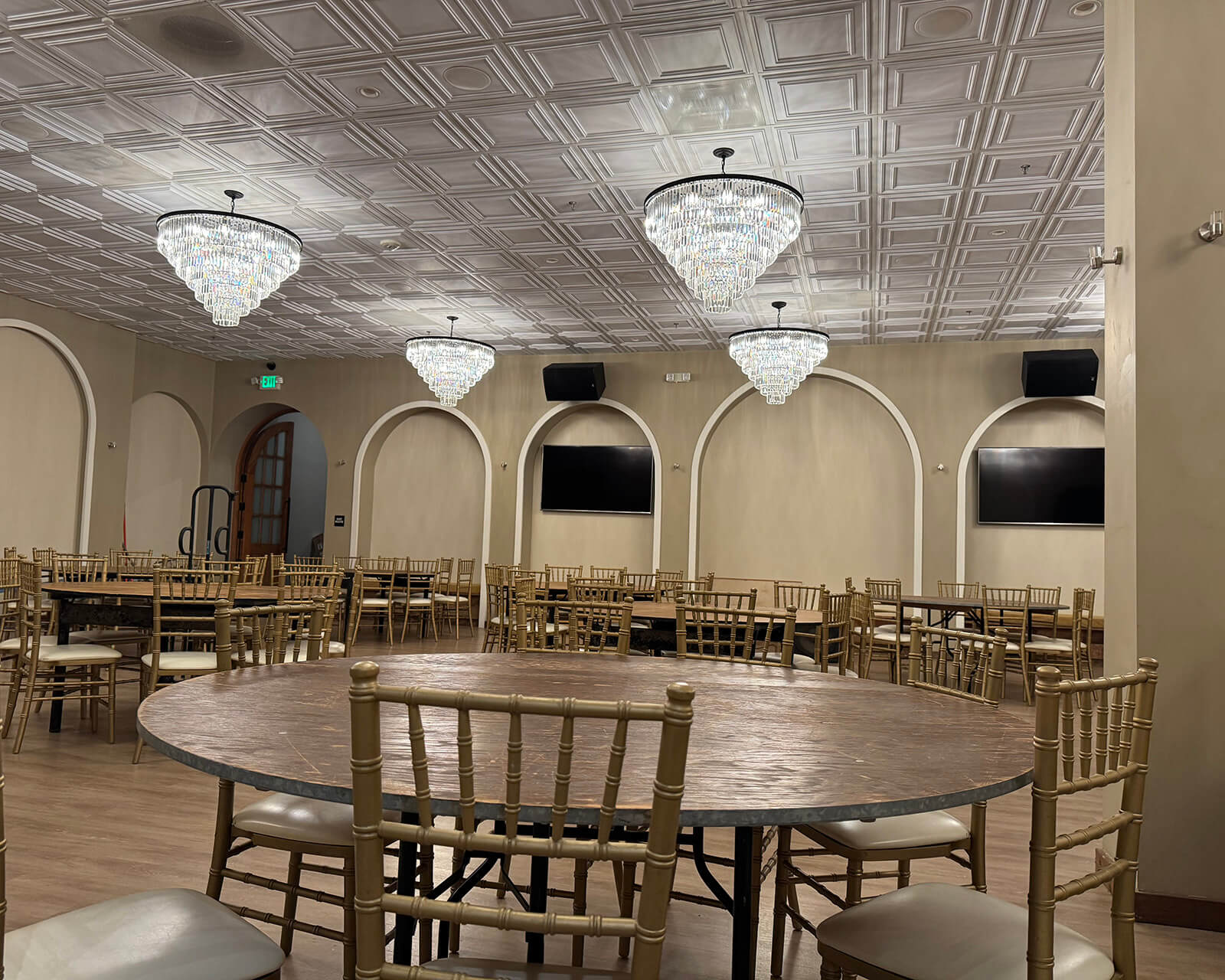 Reflecting its flexible layout, the venue was divided into multiple audio zones. An enclosed private room hosts magic shows and intimate gatherings, with its own dedicated audio. The large central hall can be subdivided with curtains to create smaller, more intimate areas, while the lobby and additional side sections operate independently when required.