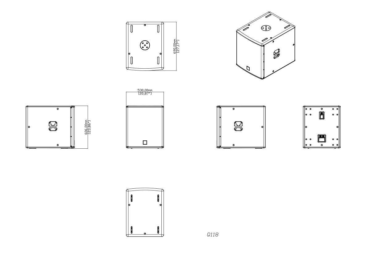 The enclosure shall be finished in durable black paint and fitted with a perforated, impact-resistant steel grille. It shall include an M20 / 1.4” (35 mm) pole-mount socket for use with full-range loudspeakers and three NL4 connectors, one of which shall be positioned for linking when the Q118 is in a vertical orientation. The cabinet shall also include integral ergonomic side handles, M10 flying inserts and rebate recesses with rubber feet for secure vertical stacking. Fittings shall be provided for optional castors.