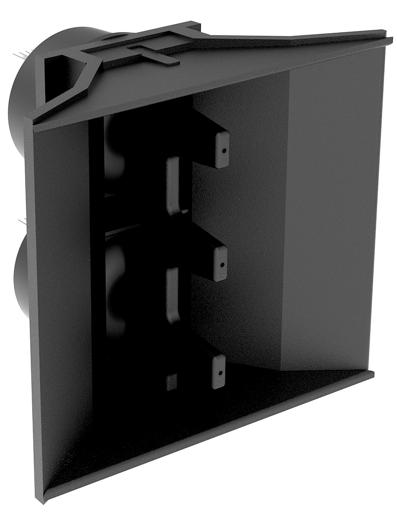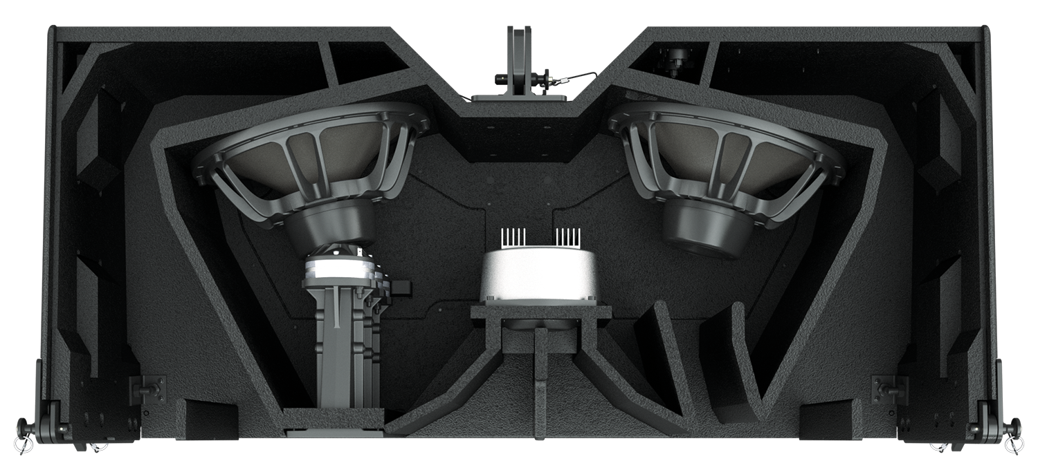 The LF section uses 2 × 12” neodymium drivers, each front-loaded by hyperbolic horns and rear-loaded by a ported chamber. A differentially flared port minimises turbulence for cleaner, more musical low-frequency reproduction. Drivers are engineered for high excursion, forced-air cooling, and low power compression, ensuring consistent output from the first note to the last.